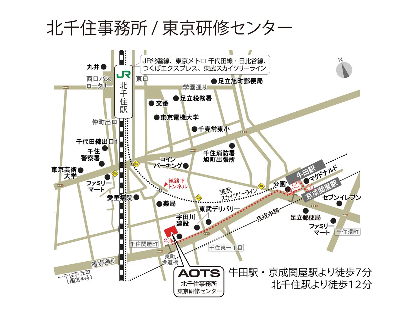 ①[京成関屋駅]改札を出たら右手に向かい、牛田駅前を左手に進みます。
