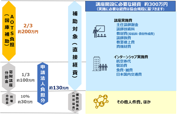 AOTSが国庫補助事業対象経費として承認した寄附講座開設費(精算額)の2/3に国庫補助金が適用されます。